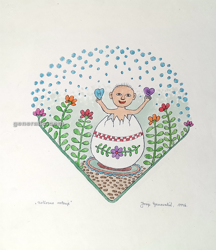 - Josip Generalić, JG-S13-02(8), Tata i kćerkica nose borove (Father and girl carrying trees), svilotisak / silkscreen in colour, 64×49 cm 33×26 cm, 1984 – 200 eur