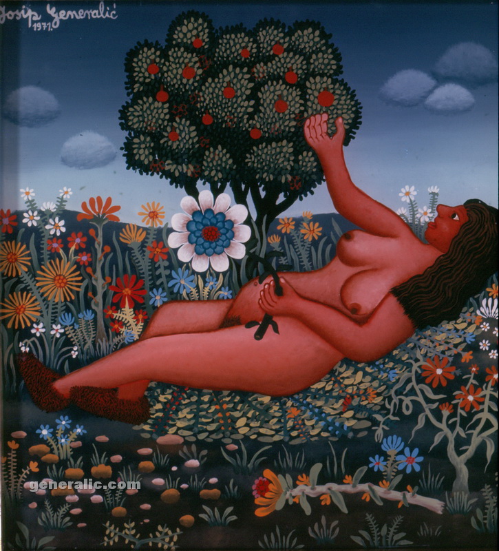 Generalic did a few scene paintings for Zagreb theatres; he ilustrated childrens’ books and made about thirty tapestries; one of them entitled the “Big Grape Harvest” is permanently displayed in the Museum of Modern Art in Soitama, Japan. Josip’s oil on glass and canvas paintings, his serigraphies and copper-plate etchings can be found in many galeries and museums. For 15 years, he’s been working intensively on copper etchings, using his own press. Generalic has been acclaimed by the critics as the top artist in the field of paintings and graphics and one of the gratest representatives of the world famous “Hlebine school”. Josip Generalic’s works of art are classified into four phases: the Hlebine verism, flower phase, portraits of distinguished persons and black phase.