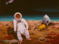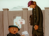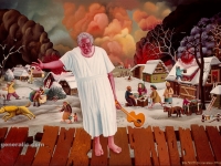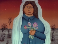His second, so-called floral phase has a softer, lyrical palette, a purified, simplified form, and a floral decor lined up on the principle of repetition. Purification continued in the 1970s when he made expressive portraits of exceptional suggestiveness, and along with paintings of his neighbours, he portrayed figures of show business, typical for his opus. Pop stars, actors, celebrities and historical persons (Sofia Loren, Tongue of John L, Janis Joplin…) can be seen in the Podravina landscape – although their physiognomy is recognizable, the form is grotesque. It is the end of the 1960s when people conquered the universe (first man on Moon in 1969), the influence of the media, and especially of television is on the rise — it is the time of enthu-siasm, astonishment, and fear when impossible becomes possible, even the Beatles in Hlebine! As with his father Ivan, in Josip’s work, too, we find a successful combination of rural and urban, but in a completely new context and way of thinking that moves the boundaries of the understanding of the Hlebine School. He has completely moved the boundaries in his black stage, where rural and urban are in conflict, and the “sophisticated Naive Art” depicted all the dark sides of civilization, technological progress, and the moral rupture of mankind. This dark phase took complete hold on him when his mother died in 1975, and when emotional disruption brought him to a chronic suspicion of the positivity and humanity of human beings. He experiences tragedies as physical wounding and disintegration, erotic-sexual symbols become freakish and wicked, man transforms into monstrous half-human creatures perverted in their own right. Real relationships are elevated to the level of mythical, fantastic, surreal (Stopped Time) in clear and pure colour and in simplified or accentuated grotesque forms.