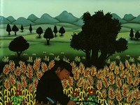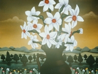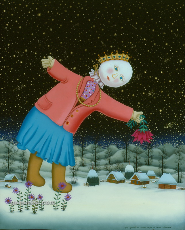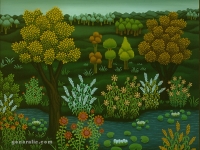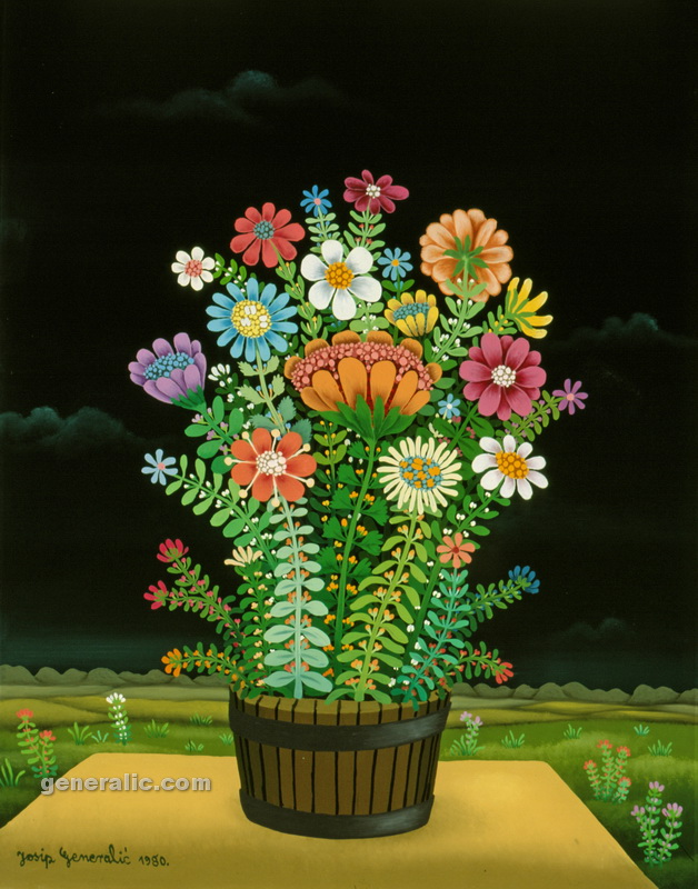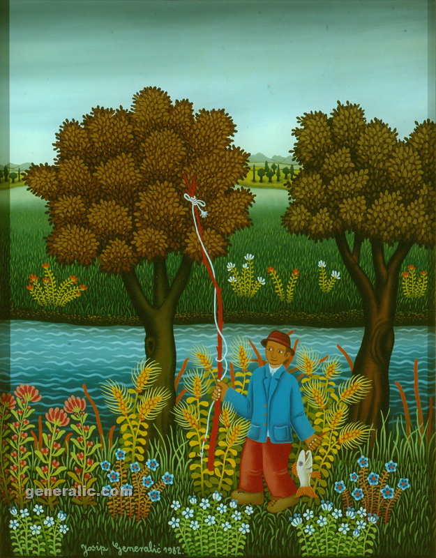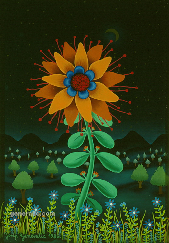 Josip Generalic, the son of the great Croatian naive artist, most of all of the members of the 2nd generation of the Hlebine School, his pressure due to his father’s art and achievements. In the very beginning of his work, Josip followed the paradigm of the Hlebine School with a typical additive method of painting, veristically accentuated, two-dimensionality, absence of modelling, clarity and “purity” of the palette, focus put on details and careful execution (which will remain recognizable in all his phases) with minimal use of perspective built up in a variety of shape sizes arranged in plans. Even in his early works, critics recognized a fear of gaps, a kind of horror vacui in the approach to painting that will be further emphasized in the second phase of his creative output that will be based on vegetal-floral motifs.